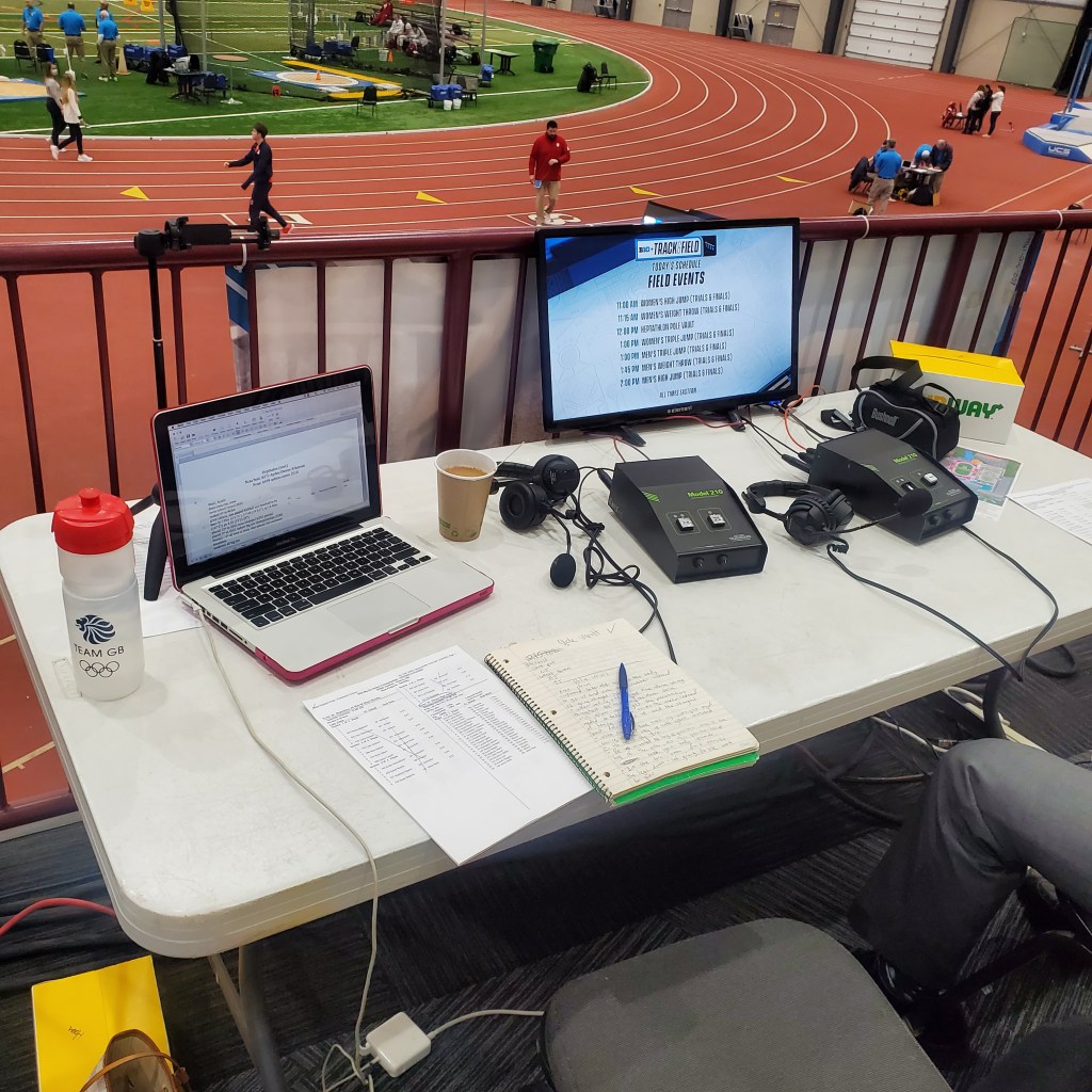 I was brought on to offer my expertise and insight into the sport and specifically commentate on the field events. Yes, you read that right. Not the hurdles, sprints, relays, and long jump: all of which I could comfortably analyze without thinking twice. But I was asked to join in on the field stream, which covered the pole vault, high jump, shot put, weight throw, triple jump, long jump, and multi-event field events. And we are not talking about play-by-play (like announcing who’s up and their season’s bests) but I was asked to analyze each attempt and give a breakdown on technique and marks.