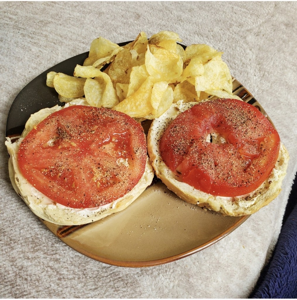 A typical lunch for me now, has been a bagel with cream cheese, sliced tomatoes, and a side of potato chips. This would have not cut it when I was in training; I tended to avoid bagels, croissants, and other breads as much as I could.