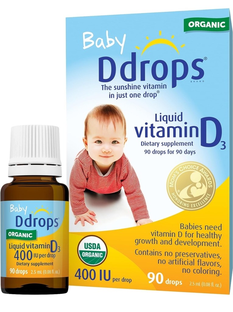 Not all new parents may be aware, but the American Academy of Pediatrics recommends that breastfed and partially breastfed babies get daily Vitamin D supplementation. I particularly love this Ddrops brand because your child gets the full recommended 400IU of Vitamin D in just one drop. You can either place the drop directly on your nipple, or inside a bottle so it has versatility.